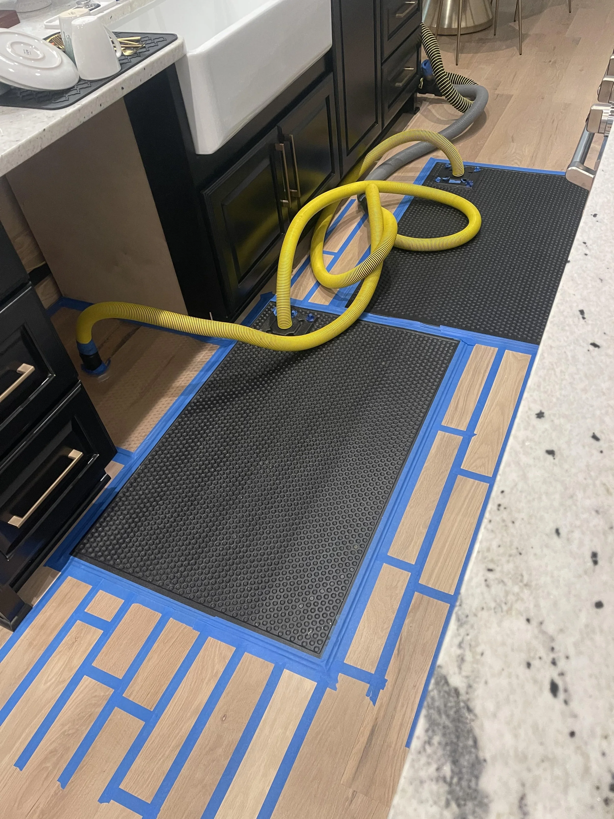 During the assessment phase, we work to determine the source of the leak as well as identify the traveled path of the damage under the wood floors.